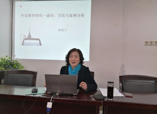 讲座由副院长徐春山主持,大英一室党支部成员、安徽省学术和技术带头人林莉兰教授主讲,主题为“外语教学研究----方法、途径与案例分析”。林莉兰围绕外语教学研究的定义与分类、基本流程、关键因素等问题,结合自身科研经历进行了翔实的讲解,并引证相关案例作具体分析。现场听众就个人教科研中的实际疑难,与主讲人进行了互动交流。