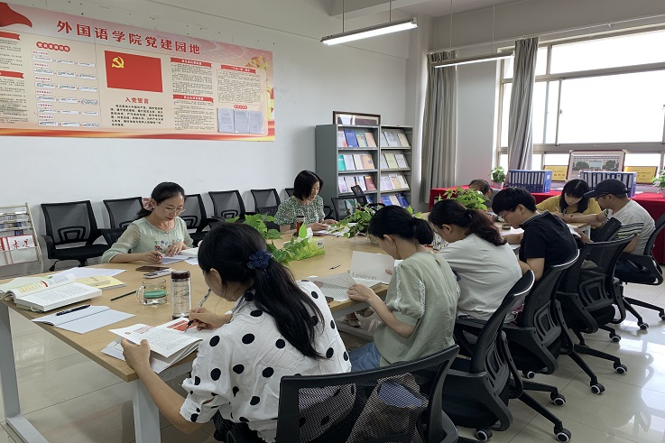 本网讯 6月8日下午,外国语学院大英一室与英语系教师党支部在1714党员活动室开展党史学习教育读书班集中学习活动。会议由支部书记靳宁主持。