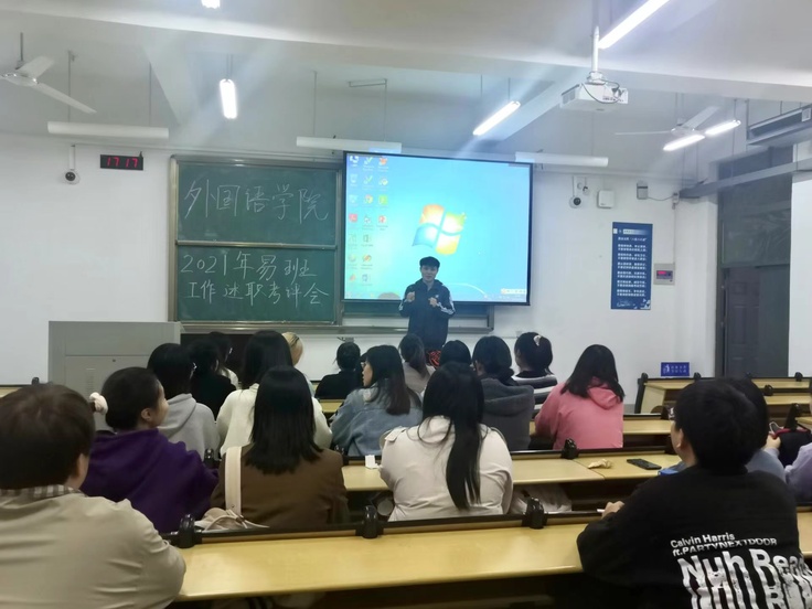 本网讯 为加强外国语学院易班工作站建设力度,提高易班工作队伍能力和水平,以评促建,以评促改,以评奖优,11月12日晚,外国语学院在主教召开2021年度易班工作述职考评会。