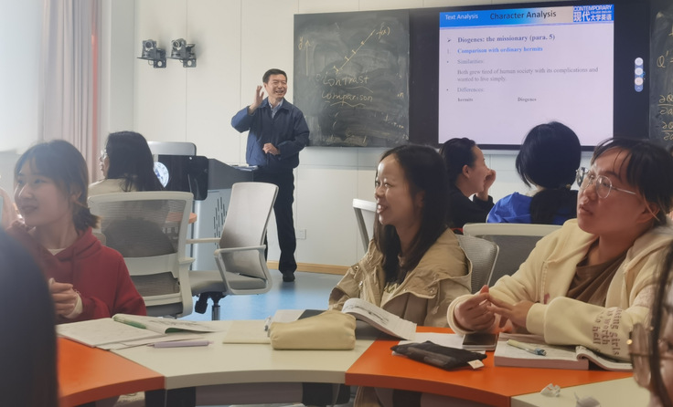 黄显怀和2021级英语3班的学生们,共同聆听了《综合英语》课程中的“Diogenes and Alexander”章节的内容,在课后与师生们开展了进一步交流,他对教师灵活的授课方式、丰富的教学内容,学生们严谨的学习态度、勇敢的表达意识给予了肯定,并分享了自己的求学和语言学习经历,勉励同学们学习语言一定要大胆开口、重视口语,积极参加相关活动,通过潜移默化的锻炼提升自己的能力和水平。