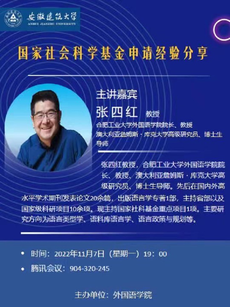 本网讯 11月7日,合肥工业大学外国语学院院长、澳大利亚詹姆斯库克大学高级研究员、博士生导师张四红教授,应外国语学院邀请作了题为“国家社会科学基金申报经验分享”的在线交流专题讲座。外国语学院全体教师参加了本次讲座。讲座由外国语学院院长徐春山主持。