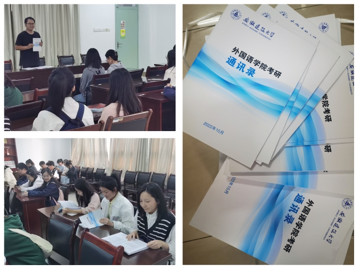 本学期开学后,学院与2017级、2018级考试上岸学生分别联系,编印《外国语学院2022年考研通讯录》,将上岸学生的录取学校、专业信息、考研经验心得以及联系方式汇编成册,方便报考学生提前与学长学姐建立联系,获得帮助指导和相关信息。