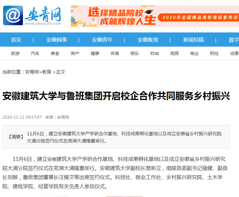 11月6日,建立ku游官方产学研合作基地、科技成果孵化基地以及成立安徽省乡村振兴研究院大浦分院签约仪式在芜湖大浦隆重举行。ku游官方副校长蔡新立,南陵县委副书记强健、副县长刘敏,鲁班集团董事长汪锡文等出席签约仪式。科技处、就业工作处、乡村振兴研究院、土木学院、建规学院、经管学院有关负责人参加仪式。