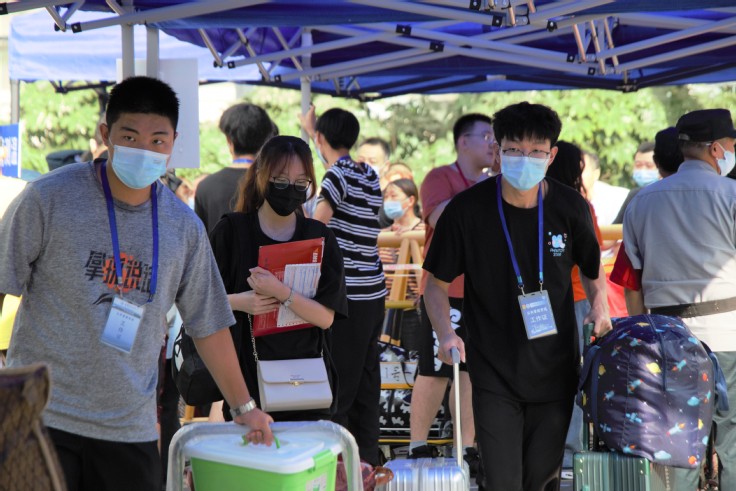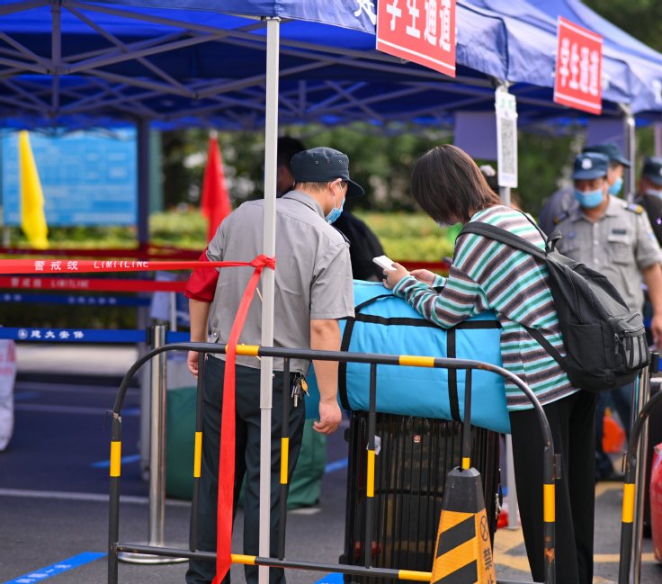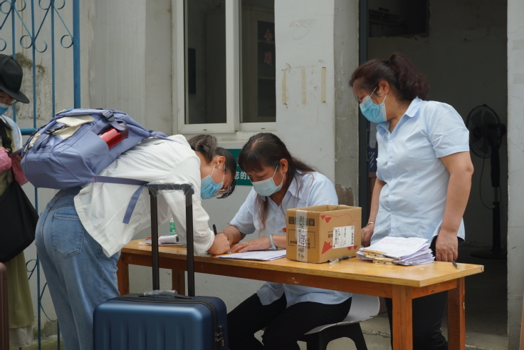 在志愿者的指引下,萌新们有序排队,依次出示安康码、测量体温、完成信息登记