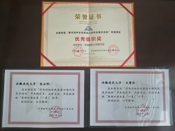 图书馆读者协会在中国图书馆学会阅读推广委员会和安徽省高等学校图书情报工作委员会等单位主办的活动中多次获得“优秀社团”称号,MOOC学社的丁若辰同学荣获安徽省数字图书馆评选的“优秀校园大使”称号。