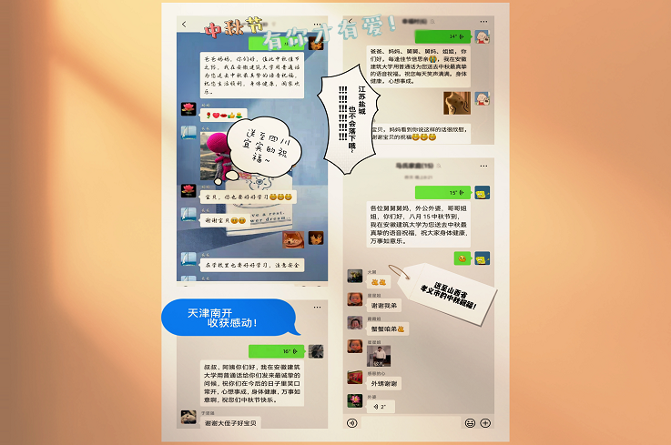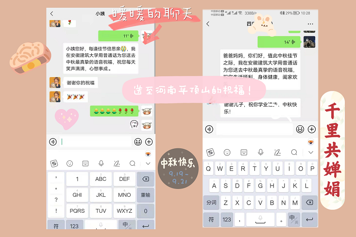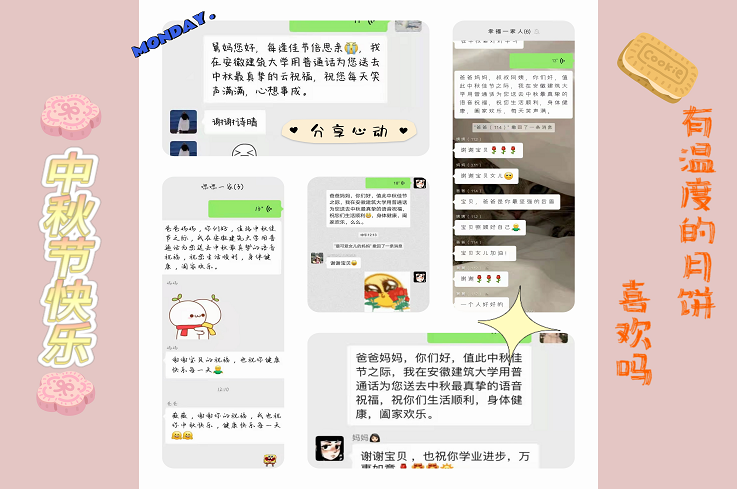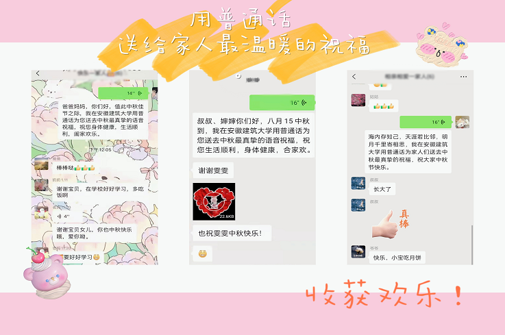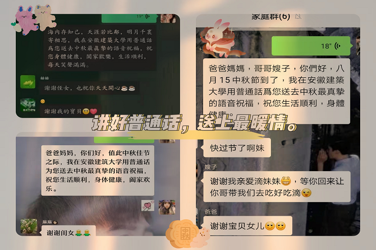 活动期间,来自各个学院、各个地区的建大学子们响应号召,踊跃参与到本次推普周活动中,于中秋佳节之际在家庭群聊中用标准流利的普通话给自己的父母和亲人们送上了最真挚的中秋祝福,同学们向亲人宣传、推广普通话,把推普工作从建大校园传播到祖国各地,充分发挥了高校在传承中华优秀传统文化、树立民族文化自信中的示范和引领作用。