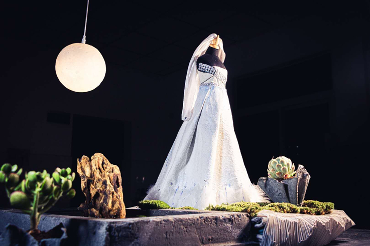 作品主体的裙子由水泥制成,用羽毛和衣物粘贴亮片适当修饰,以衣物染料绘制,最终作品成功的保留了水泥本身的纹路沟壑,让水泥不再简单地停留于刚性构造,而是可见的装饰美,突出混凝土的柔之美,让混凝土的“柔”与水泥的“刚”相互结合。