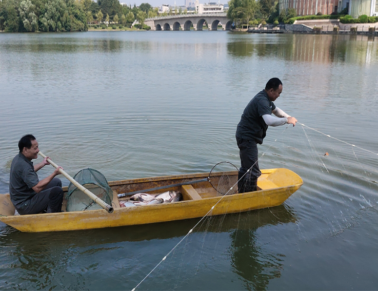 假期前一天,后勤物业中心组织员工在校园湖易海湖撒网捕鱼。在灼热的烈日下,物业员工划着小船一趟又一趟的在易海湖上打捞挂网的鱼供给各家食堂,汗水湿透衣背。