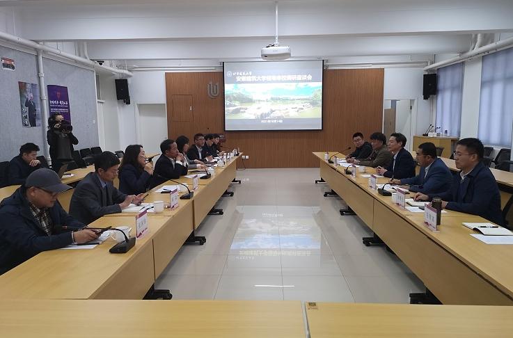 张大玉代表北京建筑大学对黄显怀一行表示热烈欢迎,并详细介绍了学校发展状况、专业特色和科研平台建设等方面的情况。黄显怀感谢北京建筑大学对我校长期以来的关心和支持,并介绍了学校贯彻落实习近平总书记考察安徽重要讲话指示精神,围绕安徽省融入长三角一体化发展目标任务,更好地服务支撑我省“三地一区”建设相关工作情况。黄显怀表示,为探讨学校如何更好地支持地方经济发展,希望能与北京建筑大学在未来城乡研究、智慧建造建筑产业、绿色城市建设、节能减碳等方面加强交流与合作。