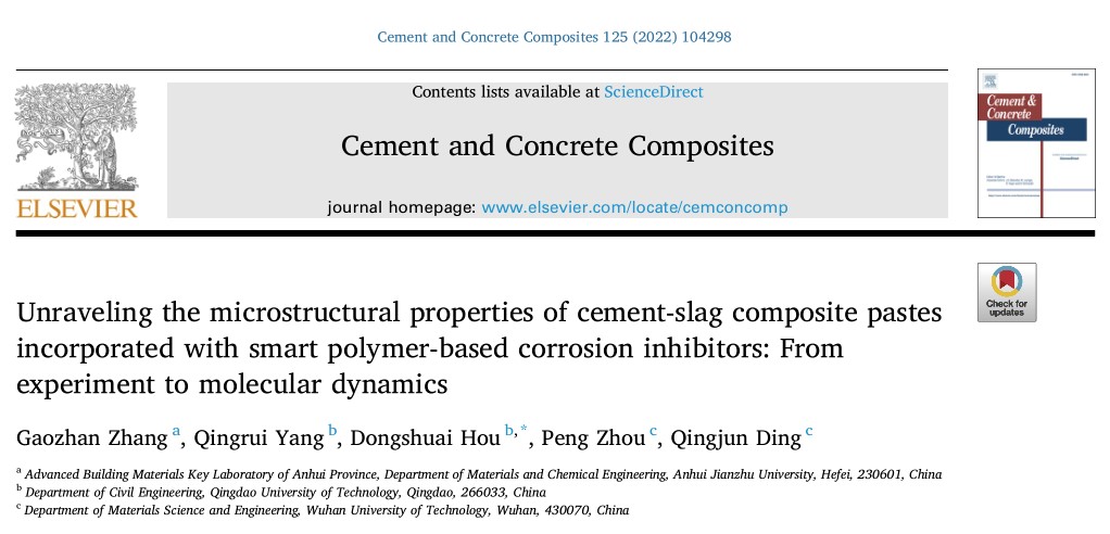 本网讯  近日,我校先进土木工程材料科研团队张高展副教授联合青岛理工大学侯东帅教授和武汉理工大学丁庆军教授等在Cement and Concrete Composites》(中科院1区,影响因子7.586)上发表题为“Unraveling the microstructural properties of cement-slag composite pastes incorporated with smart polymer-based corrosion inhibitors: From experiment to molecular dynamics”的研究论文(https://doi.org/10.1016/j.cemconcomp.2021.104298,《Cement and Concrete Composites》简称CCC,与《Cement & Concrete Research并列为建筑材料领域两大顶级期刊)。