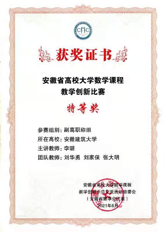 本网讯 近日,数理学院李璐老师在安徽省高校大学数学课程教学创新比赛中荣获副高职称组特等奖,并被推荐参加11月份举办的首届全国高校大学数学课程教学创新示范交流活动。