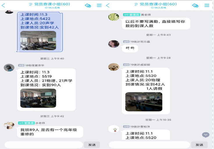 学风督导严考勤。为进一步健全和完善学风建设长效机制,建立长效的学生日常行为督导体系,规范学生上课、晚自习纪律和考勤管理制度,学院成立“学风督查小组”,由学生党员与学生会工作人员组成,负责日常课程、晚自习考勤工作,每天在群里上报学生课程考勤情况,针对缺课、迟到学生辅导员进行谈心谈话,引导学生养成良好学习习惯,夯实学院学风建设组织基础。