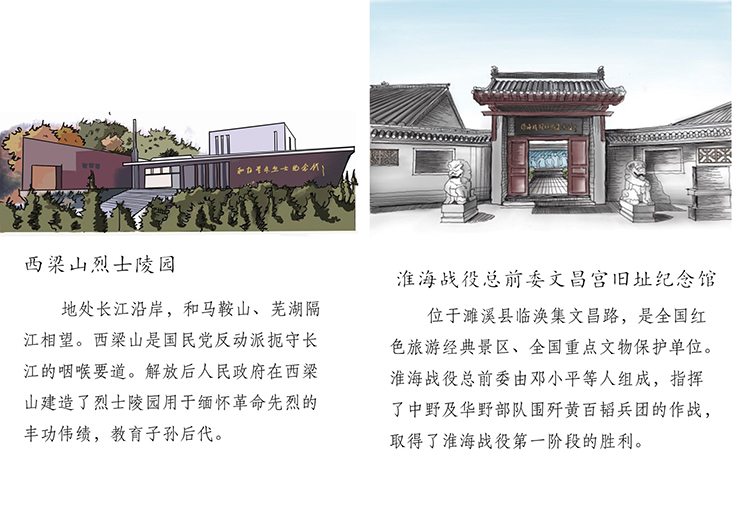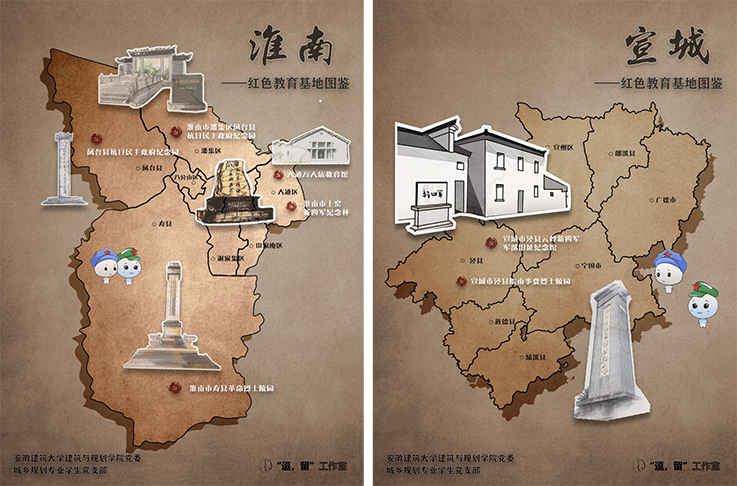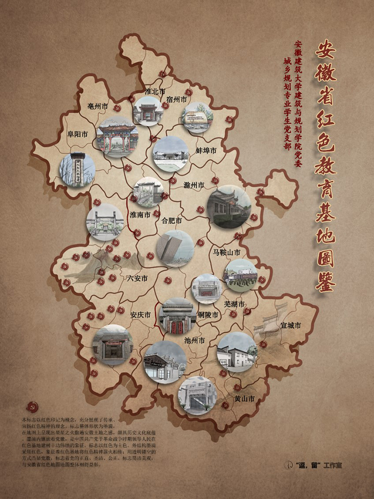 《安徽省红色教育基地图鉴》分为安徽省总图与地区图鉴、制作花絮三个部分,以泛黄的宣纸为底,用手绘建筑点缀,一个个红色印章印刻下中国共产党在安徽省留下的一串串足迹。广大青年党员约一场别样的红色之旅,让更多的红色景点,成为人们聆听红色故事、致敬英雄模范的“打卡地”。