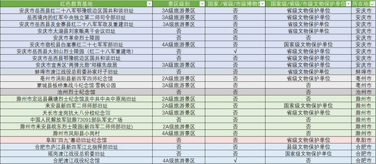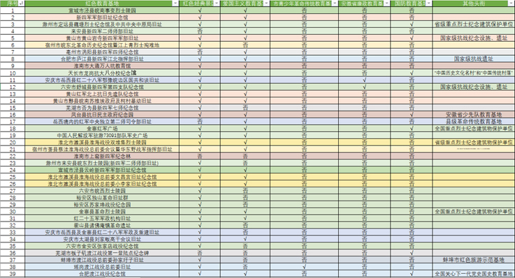 为能更好地挖掘和利用安徽省红色教育资源,支部学生党员前期查阅大量资料,获取关于安徽省红色教育基地信息,并将基地按其所在城市分门别类。与此同时,支部还查阅了基地分类情况,将各类信息分类整合,直观的呈现了各教育基地的重要信息,便于师生们根据自身需求选择想要参观的红色教育基地。
