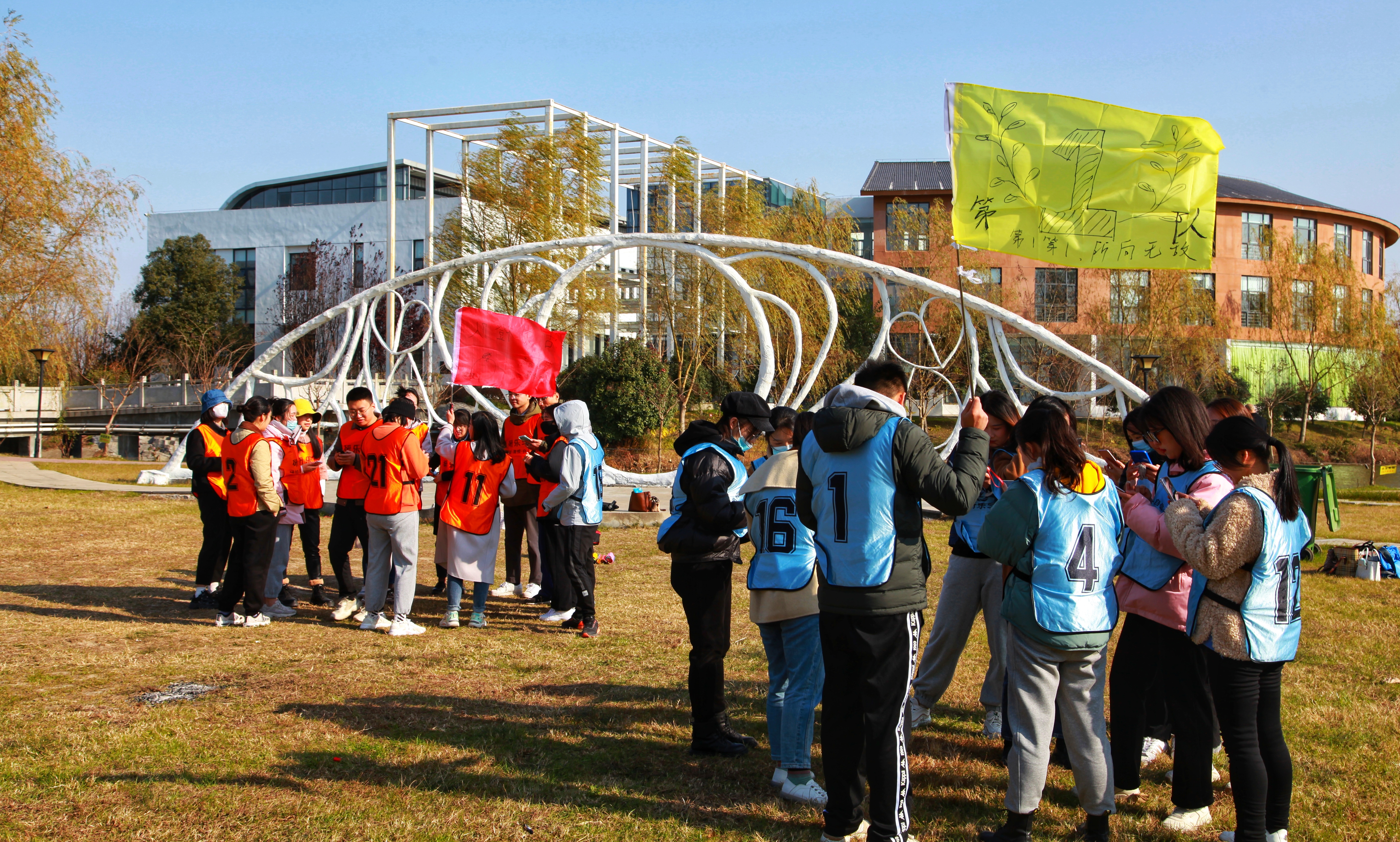 校史校情教育结束后,队伍来到了舒城五里桥进行户外拓展活动。破冰环节中,通过欢快的活动,打破人与人之间的隔阂,建立相互信任的基础,营造团队氛围。通过小游戏随机分组,组建了两支队伍,队员们起队名、想口号、做队旗,齐心协力完成团队任务。