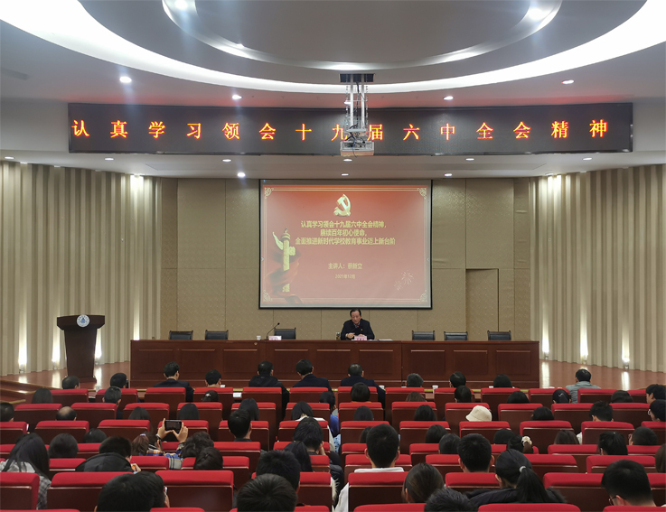 本网讯 12月10日,副校长蔡新立以“认真学习领会十九届六中全会精神,赓续百年初心使命,全面推进新时代学校教育事业迈上新台阶”为题,在北校区图书馆报告厅为师生党员上专题党课。经管学院党委、后勤集团党总支、离退休工作处、财务处、科技处、科技成果转化中心等相关单位的师生党员共计220余人聆听了党课报告。报告会由经管学院党委书记主持。