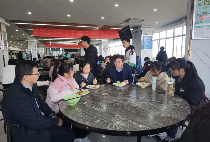 用餐期间,黄显怀与外国语学院师生们在食堂内围坐圆桌,从孩子们的家乡聊起,询问学生生活是否习惯、学习能否跟上、食堂的饭菜合不合口味、和高中食堂相比现在的菜价是否满意……同学们开怀畅谈,和校长分享着校园生活的点点滴滴。黄显怀告诉同学们,刻苦学习需要充沛的精力和体力,学校一直把食品安全、食品健康当作服务学生的大事来抓,着力为师生们创造良好的就餐环境,提供优质的饮食保障,同学们也要发挥主人翁意识,多提意见、加强监督,同时要提倡节约、文明用餐,共同为创建文明校园作出贡献。