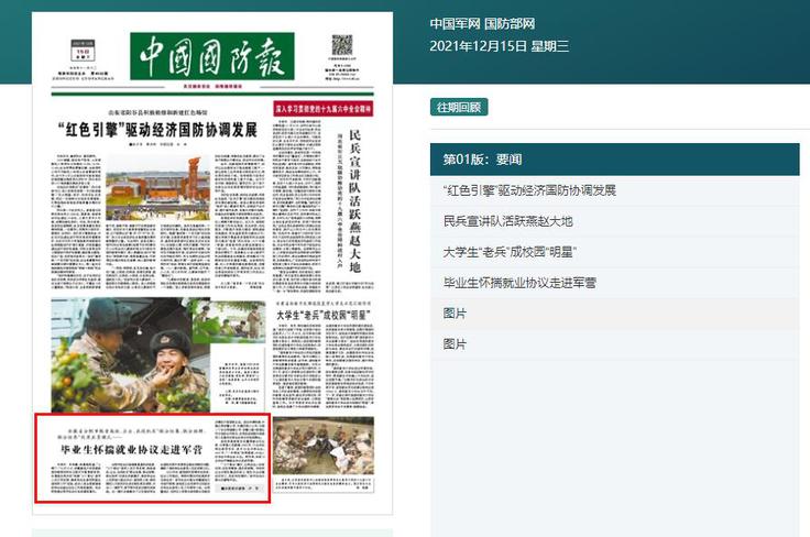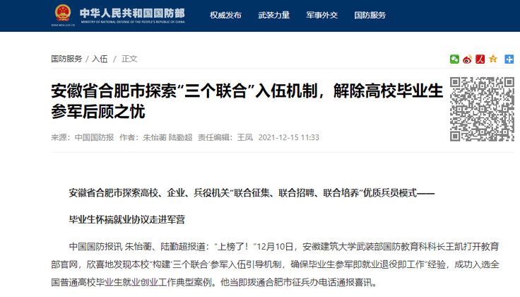 编者按: 12月15日,《中国国防报》头版刊发《安徽省合肥市探索高校、企业、兵役机关“联合征集、联合招聘、联合培养”优质兵员模式--毕业生怀揣就业协议走进军营》,详细报道我校以“三个联合”助推征兵工作模式。中国国防部网站同步进行转载推介。