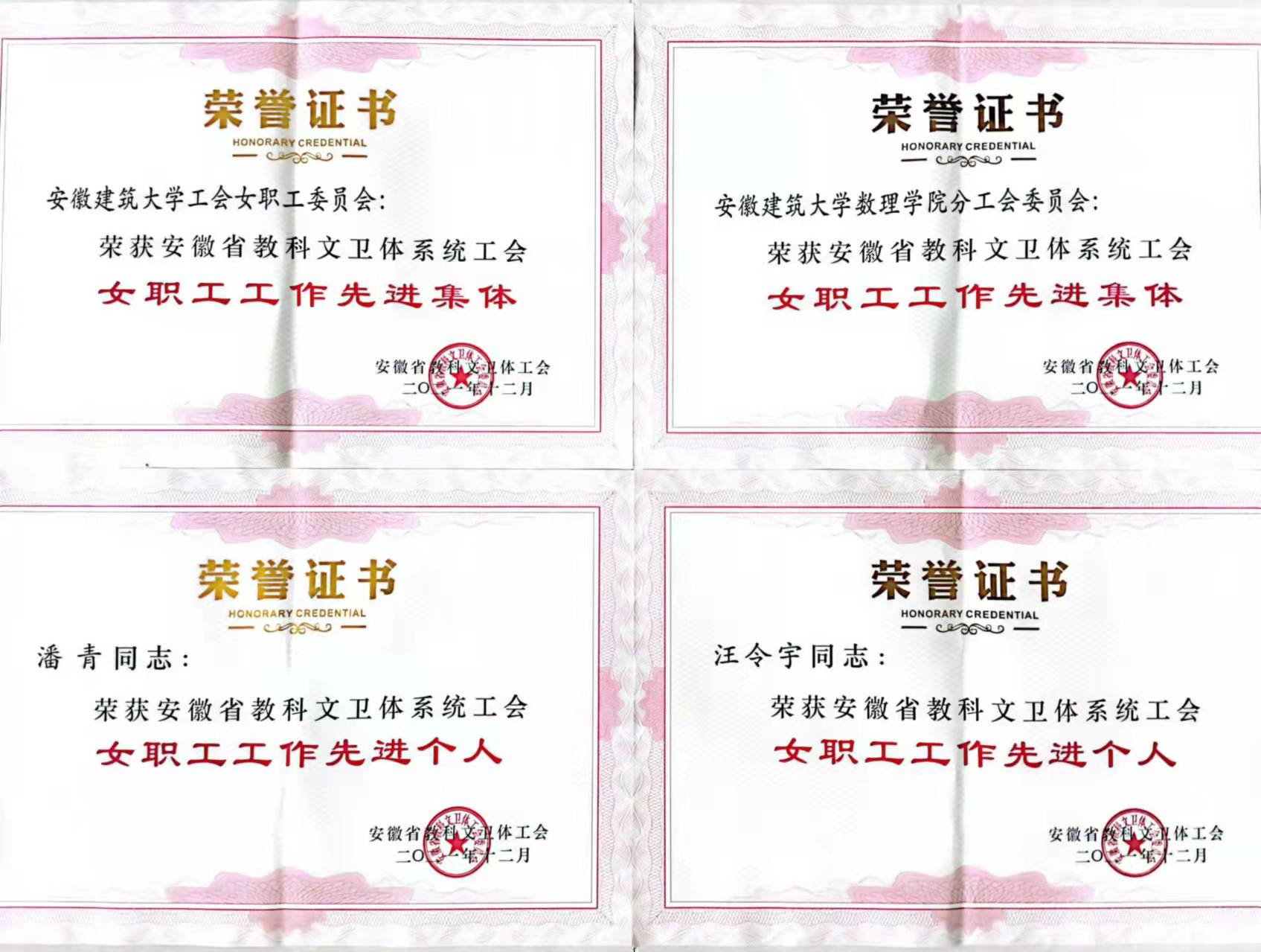 本网讯 近日,安徽省教科文卫体工会印发《关于选树安徽省教科文卫体系统工会女职工工作先进集体、先进个人的通报》,我校工会女职工委员会、数理学院分工会荣获“安徽省教科文卫体系统工会女职工工作先进集体”荣誉称号,外国语学院汪令宇、艺术学院潘青荣获“安徽省教科文卫体系统工会女职工工作先进个人”荣誉称号。