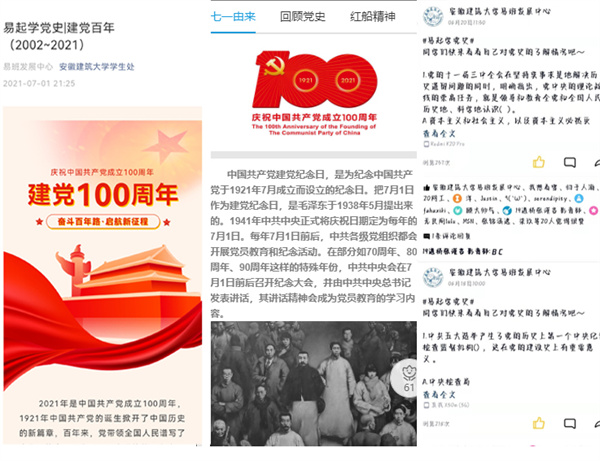 ku游官方易班发展中心不断拓宽宣传渠道,扎根“ku游官方学生处”微信公众号、“ku游官方易班发展中心”官方QQ和“易班·今日校园”,开展“易起学党史”线上宣传活动。在“ku游官方学生处”微信公众平台开设“建党百年”专题,累计推送党史知识普及文章10余篇;在“ku游官方易班发展中心”QQ平台每日开展党史知识小问答,累计发布主题动态70余条;通过“易班·今日校园”制作并发布“百年奋斗路 启航新征程”轻应用宣传页,浏览量近2000人次。依托各类宣传载体进行优质网络内容供给,引导同学们将“学党史悟思想”和个人成长成才紧密结合起来,从党的百年历史中领悟思想的伟力,进一步培养爱国情怀,砥砺奋斗之志,营造了浓厚的党史学习氛围。