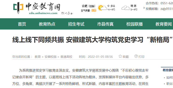 编者按:为推进党史学习教育走深走实,学校易班发展中心围绕“不忘初心跟党 走牢记使命开新局”主题,以易班线上线下活动阵地为载体,发挥新媒体平台内容输出优势,构筑党史学习“新格局”。1月5日,中安在线对此进行了报道。