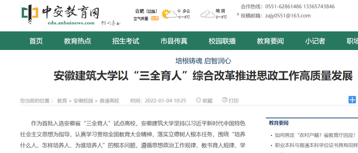 编者按:作为首批入选安徽省“三全育人”试点高校,我校多措并举,统筹办学治校各领域、教育教学各环节、人才培养各方面的育人资源,不断深化“三全育人”综合改革,推进学校思想政治工作高质量发展。1月4日,中安在线对此进行了报道。