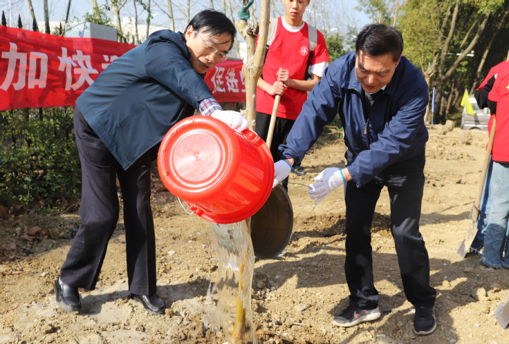植树活动开始后,大家纷纷挽起袖子,拿起铁锹,积极投入到义务植树活动中。大家配合默契,干劲十足,或挥锹铲土,或扶苗培土,或踏土夯实,每道工序都专注细致、一丝不苟,合力栽下一棵棵树苗,一派忙碌有序的劳动场景,处处洋溢着植绿护绿的欢声笑语。在师生的共同努力下,72棵紫薇树苗昂然挺立,迎来了它们在建大的第一个春天,不久将成为校园里一道靓丽的风景。