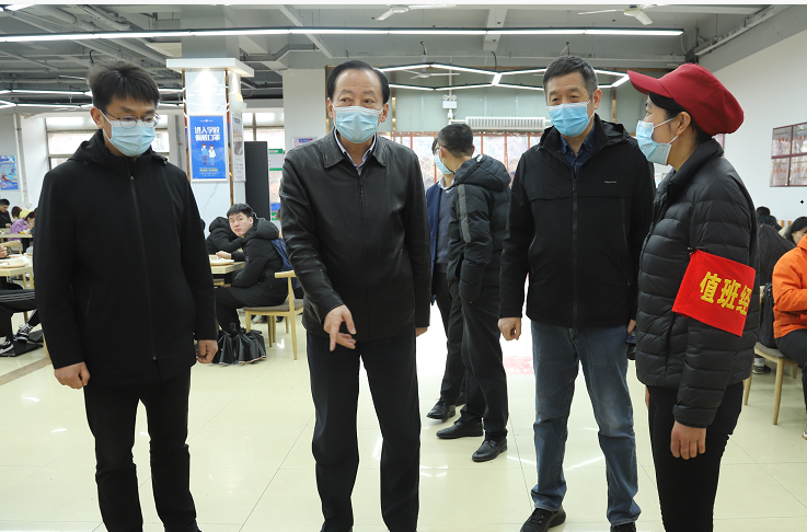在食堂,校领导询问了各类菜品和主食的供应情况,详细了解食堂的防护措施和消毒情况,认真查看窗口的饭菜供应情况,嘱咐员工们一定要以大局为重,认识到自己岗位的重要性,做好个人防护,戴口罩、勤洗手,保护好自己就是保护好师生。