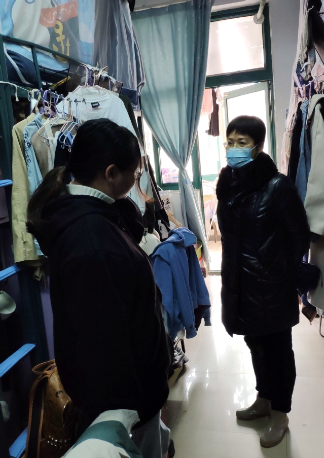 在宿舍,校领导了解宿舍楼进出体温检测、环境消毒、垃圾处理等各个重点事项,询问学生目前在校学习和生活情况,希望同学能理解现在疫情防控工作,积极配合,听从学校安排,减少流动,做好自我防护,遇到困难及时跟学校及辅导员沟通,保护好自己的健康和安全,常向家人报平安。