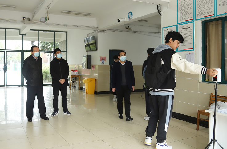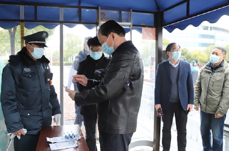 在南校区门卫处,校领导询问进出校园的管控情况,并认真检查进出校门登记台账。自3月18日起,学校两校区实行封闭管理,严格人员进出登记、扫码及体温测量等工作。校领导叮嘱负责保卫工作的员工,一定要严格落实管理要求,防护好、保卫好,守好“校园门”,才能护好“一校人”。同时要做好个人的防护措施,在这样关键的时刻,以高度的责任感,继续坚守岗位。