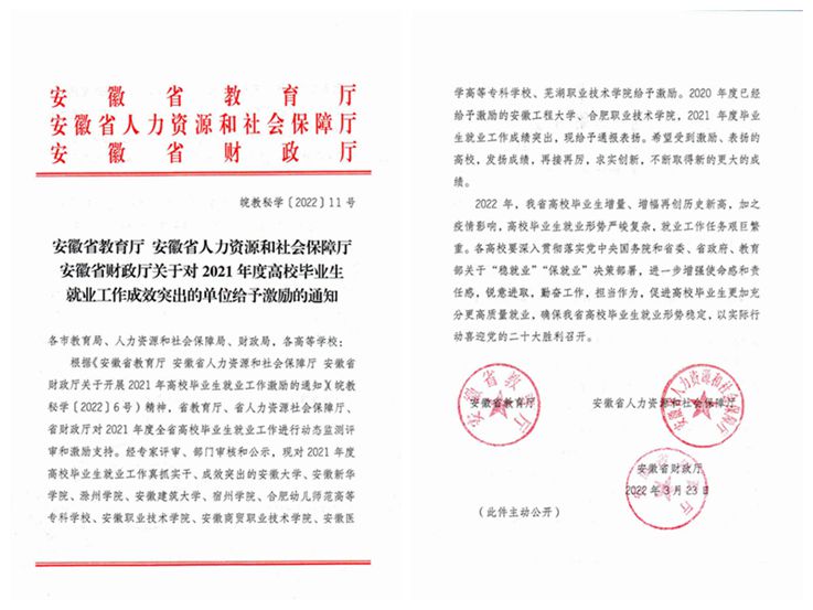 本网讯 近日,安徽省教育厅、安徽省人力资源和社会保障厅、安徽省财政厅联合印发《关于对2021年度普通高校毕业生就业工作成效突出的单位给予激励的通知》(皖教秘学〔2022〕11号),表彰2021年度普通高校毕业生就业工作成效突出单位(10所高校,其中本科高校5所)。我校在全省100多所高校中脱颖而出,获此殊荣,并获激励资金30万元。