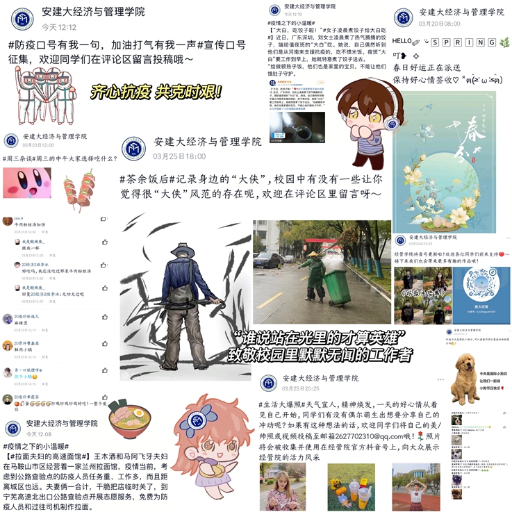 学院采用线上线下相结合的方式,全面开展防疫宣传,及时发布疫情信息,普及防疫健康知识,全方位、不间断让防疫知识入脑入心。从官Q、微信公众号、抖音、经管易班等线上新媒体平台入手,采用“四格漫画”、短视频、手势舞等当下青年学子喜闻乐见的形式,将防疫宣传融入到学生学习生活的方方面面,做到防疫宣传常态化、多样化,充分利用网络的传播力筑起学院防疫墙。