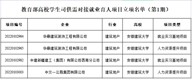 本网讯 近日,教育部高校学生司《关于公布第一期供需对接就业育人项目立项名单的通知》(教学司函〔2022〕7号)文件公布了第一期供需对接就业育人项目立项名单。经学校申请、校企多轮洽谈与对接,就业工作处与中交一公局集团有限公司、中建新疆建工(集团)有限公司西南分公司、华鼎建筑装饰工程有限公司等3家企业的就业实习基地与人力资源提升4个项目获得立项。