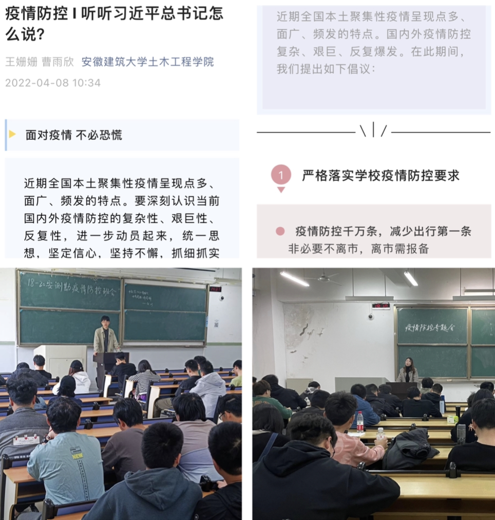 疫情特殊时期,做好学生防疫的宣传教育至关重要,辅导员们积极开展疫情防控专题班会,全覆盖、多频次宣讲。认真分析当前疫情严峻形势,细致介绍学校疫情防控相关政策,并做好校园疫情典型案例的通报,以此增强学生疫情防控的自我认知。同时,发挥网络主阵地作用,通过QQ群、微信群实时传输疫情防控动态讯息和校园文件,如各地疫情新增数据、全员核酸检测通知、《疫情期间学生请销假明白纸》等,帮助学生及时掌握疫情动态和校园防疫措施。借助易班、微信公众号平台推送《疫情防控——听听习近平总书记怎么说?》《致全体土木学子的一封信》《您有一份“疫情快讯”待收》等有关疫情防控的重要推文,强化防疫宣传成效,引导学生有意识、守规矩的参与到校园助“疫”行动之中。