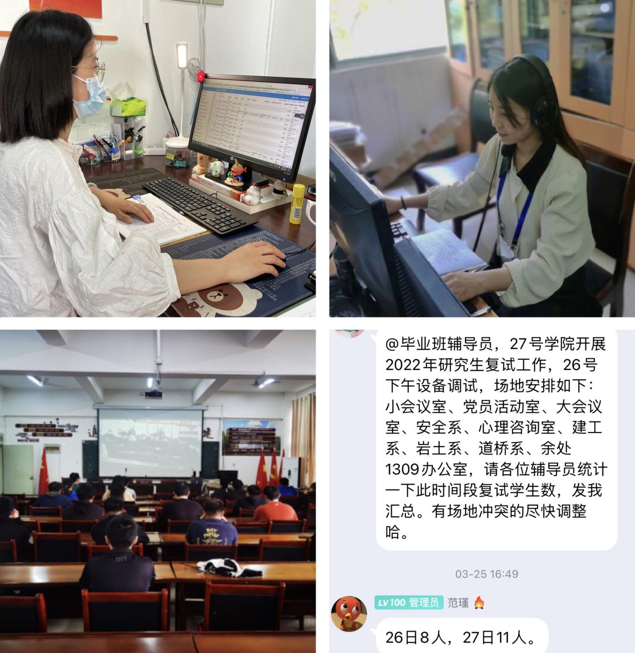 考研和就业在疫情当下就像两座大山摆在毕业班学生面前,同样的也给辅导员们带来巨大压力,自学生考研复试以来,毕业班辅导员做的最多的就是“煲电话”“找教室”“刷网页”。在考研成绩出来后就陆续联系学生,开展动态跟踪和复试指导,对考的不好的学生进行安抚和疏导,避免学生负面情绪得不到释放。对于能够进入复试的学生则是多方联系、合理有序的帮他们安排和协商复试场地,并辅助做好设备调试工作,确保在疫情防控期间学生能够安全且放心的投入复试中。与此同时,为了最大限度保证上岸率,辅导员们也是实时关注和查看各大高校的调剂情况,及时给学生推送复试调剂信息。另一方面,做好考研保障的同时就业工作也同步在推进,一有招聘信息辅导员们就第一时间在就业群及班级群推广,并实时联系就业单位点对点进行学生就业推荐。开展校友“云课堂”,邀请优秀校友讲述奋斗故事、分享创业心得、分析就业形势、传授求职经验,凝聚合力促就业,全力以赴为学生实现梦想保驾护航。