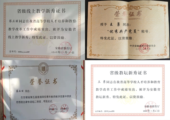 建强基层组织体系,充分发挥“双带头人”的“领头雁”作用。近年来,党支部书记王勇获安徽省“教坛新秀”、安徽省委讲师团青年宣讲名师、校“优秀党务工作者”、校“优秀共产党员”、校“优秀教师”、校“本科教学管理先进个人”等称号,在省教育厅首届高校思政课教学展示暨教师说课比赛中获得二等奖。宣传委员蔡正丽荣获校级“优秀教师”,被评为安徽省线上教学新秀,获安徽省第五届普通高校青年教师教学竞赛思政专项组二等奖。