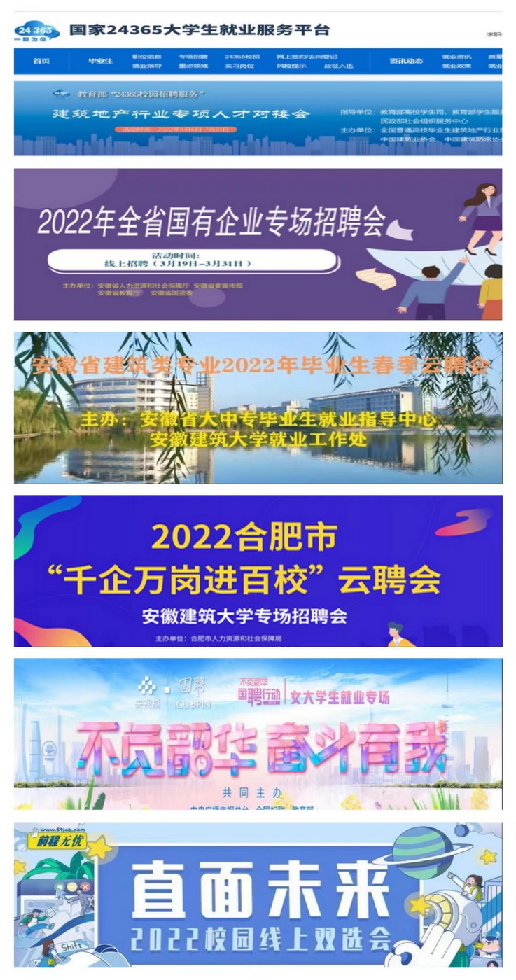 多方携手促就业。学校根据毕业生专业特点,举办了安徽省建筑类毕业生就业市场暨ku游官方2022届毕业生春季云聘会、女大学生春季云聘会、文科类毕业生春季云聘会、合肥市“千企万岗进百校”ku游官方专场云聘会等,合计参会企业420余家,提供了2560个职位3万多个岗位。与同济大学等高校合办教育部24365建筑地产行业专场招聘会,与前程无忧合办“直面未来:2022春季校园线上双选会”。大力宣传和鼓励毕业生参加安徽省国有企业专场招聘会、国聘行动“不负韶华、奋斗有我”女大学生就业专场。全力为毕业生提供更多就业岗位,进一步拓宽毕业生就业渠道。学校就业信息网开辟“政策招考”专栏,及时发布西部计划、三支一扶、选调生、大学生村官等基层就业信息和大学生应征入伍相关政策,引导和鼓励毕业生扎根基层,报效祖国。