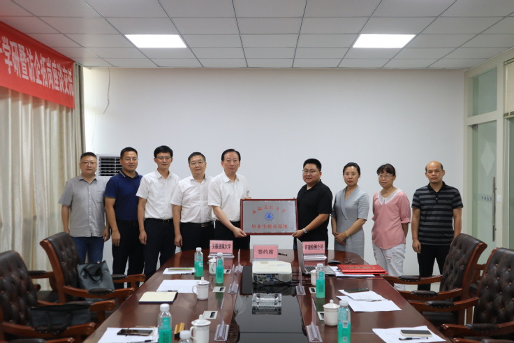 蔡新立和崔玉宝代表校企双方签订了大学生就业实习基地建设协议,共同为“毕业生就业实习基地”“科技成果孵化基地”揭牌。