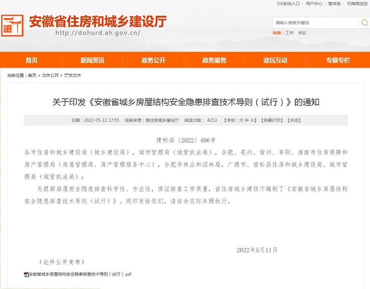 本网讯 为深入贯彻习近平总书记重要指示精神和李克强总理批示要求,深刻汲取长沙自建房倒塌事故教训,严防类似事故在我省发生,根据省委、省政府工作部署,决定在全省范围内组织开展自建房屋安全专项整治,住建厅紧急组织编制《安徽省城乡房屋结构安全隐患排查技术导则(试行)》,我校作为主编单位编制该导则。