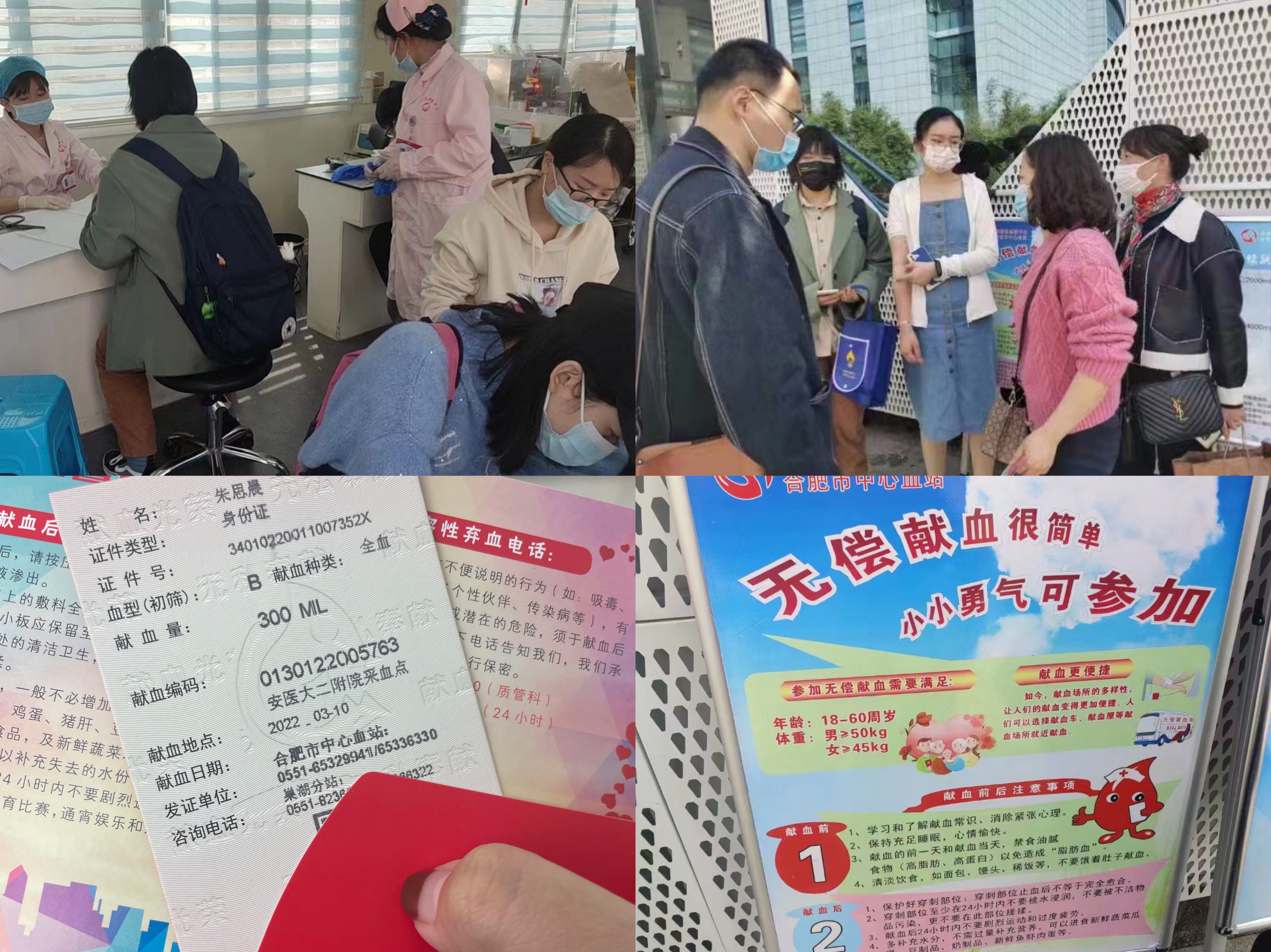 3月10日上午八点半,朋友圈内一条急求爱心献血的消息引起了19级建环专业曹欣雨同学的注意,8岁的小女孩菲菲突发白血病,在安徽医科大学第二附属医院血液科医治,期间癌细胞扩散迅速,化疗后,小菲菲身体虚弱大出血,情况危急,需大量用血,但医院血库B型血液不足,因此爱心人士在朋友圈发出求助信息,呼吁大家为挽救孩子生命尽微薄之力。情况危急,时间紧迫,曹欣雨立即将消息告诉周围同学并请同学们予以支持,上午十点钟,曹欣雨和朱思晨、李明月、于海林四名同学前往安医二附院,共计献出1100毫升鲜血。
