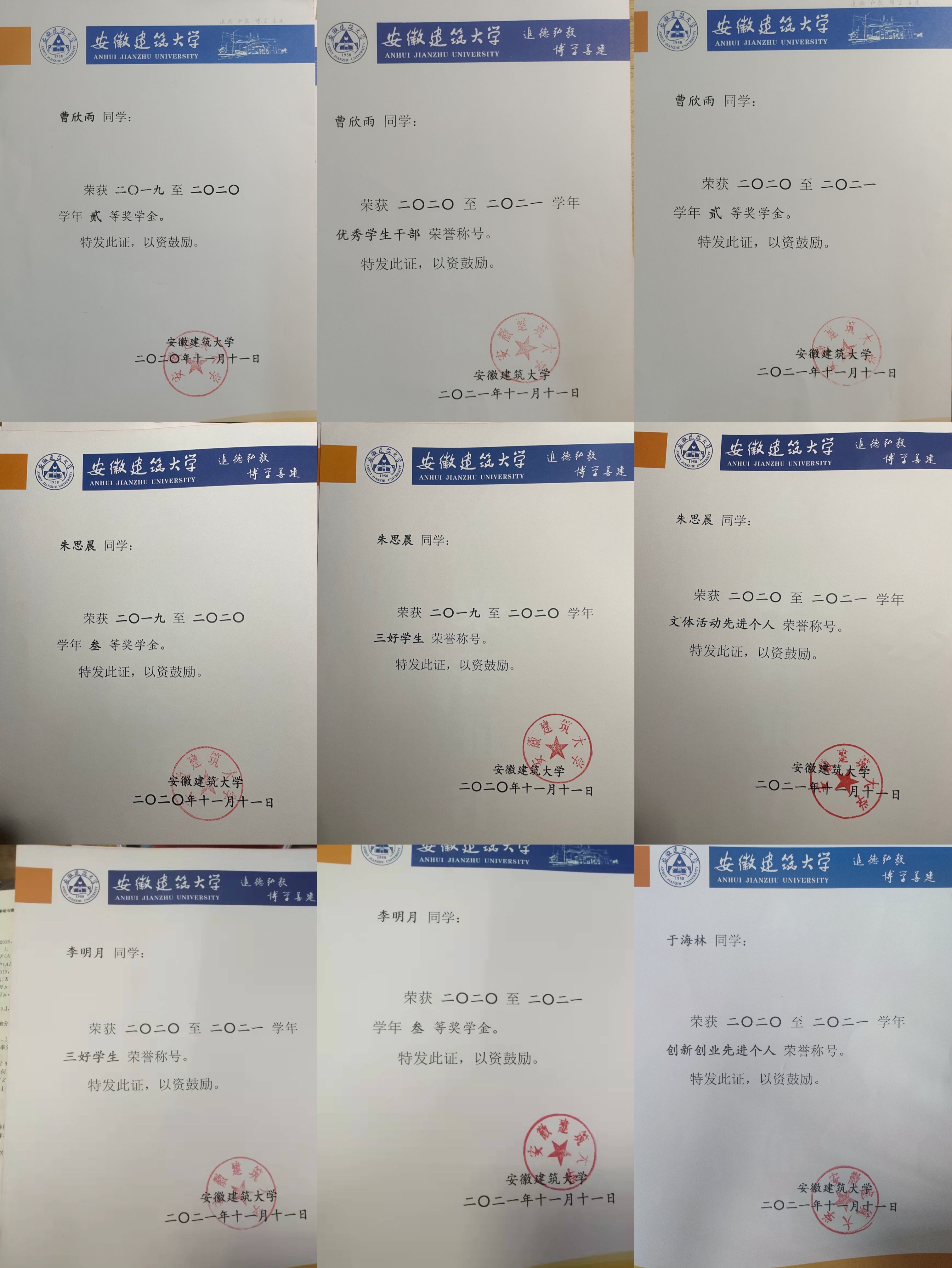 曹欣雨、于海林同学荣誉证书