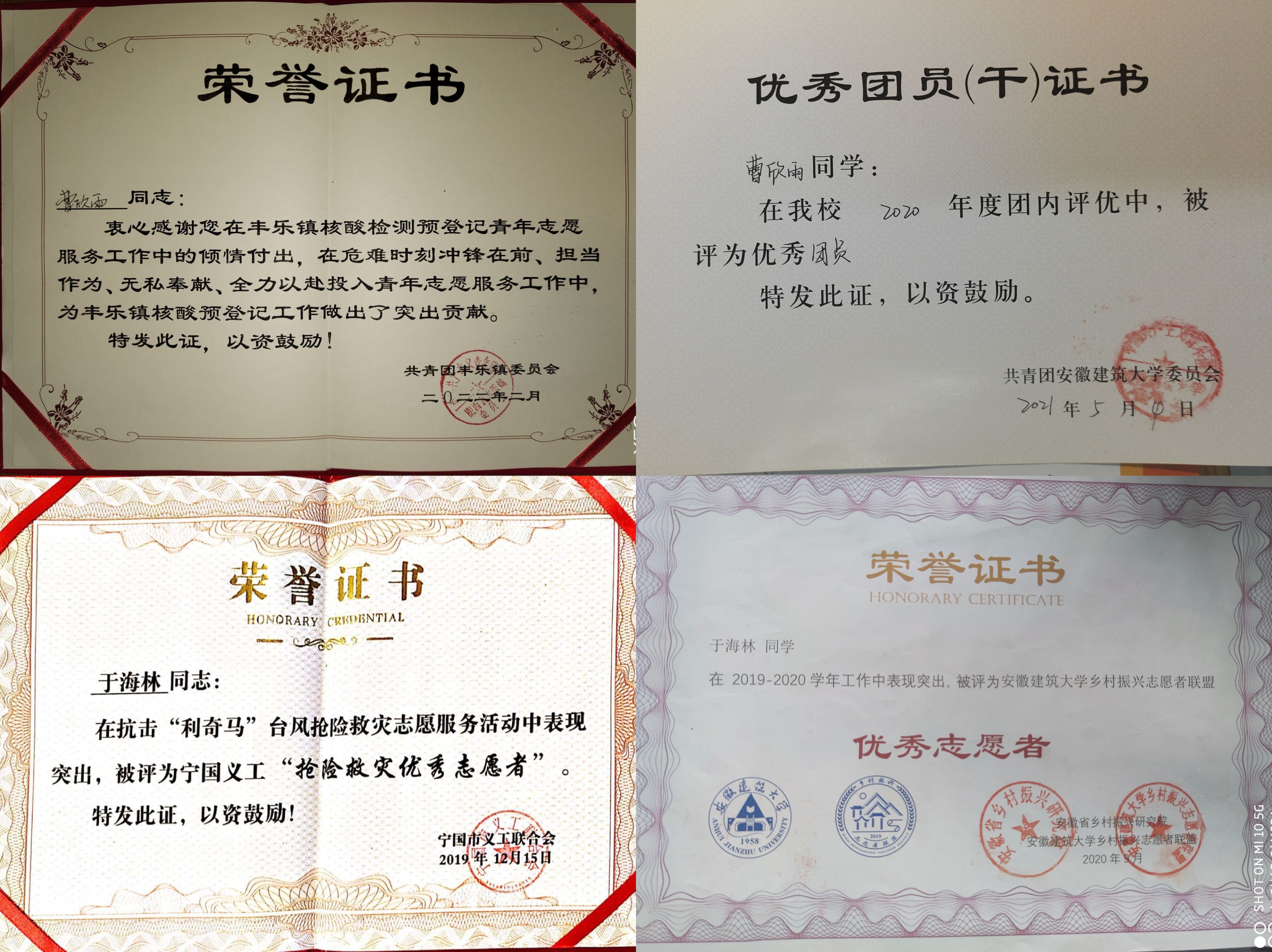 据了解,四名学生都十分热爱公益事业。今年年初,曹欣雨、于海林都是家乡的疫情防控志愿者,在村里帮助老人申领健康码,组织村民有序排队做核酸。本学期学校封闭式管理期间,四名都学都报名了食堂志愿者,为过往的同学们量体温,宣传防疫知识,维持食堂就餐秩序。朱思晨、李明月、于海林都曾在献血车进校园时献过血,李明月现在依然是流浪猫救助协会的会员。于海林从初中就开始做环卫工志愿者,“利奇马”台风席卷家乡宣城宁国时,他又挺身而出成为一名“抗洪志愿者”,他还加入了学校乡村振兴志愿者联盟,不定期去养老院照看老人。