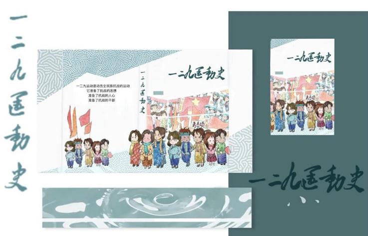 作品《一二九运动史》采用白蓝相间的构图方案,以水纹点缀其间,颜色简洁大方,充满活力而不失沉稳,描绘了当代青年对于革命历史的理解,体现了广大人民团结一心的光荣传统。