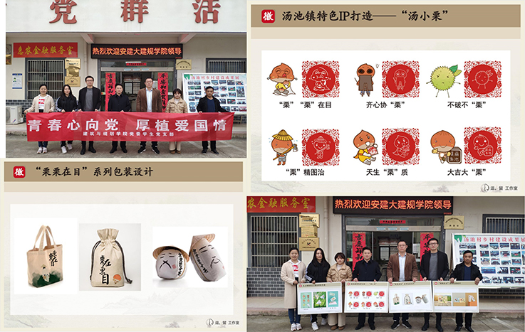 为帮助学校定点扶贫单位舒城县汤池村进一步发展产业,党支部以文化赋能特色产品,徽韵助力地方产业,提炼汤池地方特色产业,打造原生IP形象“汤小栗”,推出天生“栗”质、“栗”精图治、大吉大“栗”等系列形象,并结合IP形象设计“栗栗在目”系列包装,融合环保理念,推出棉麻系列包装,引入盲盒(盲盒——一种在相同的盒子里放置不同的商品,但有一定概率能够抽到心仪商品的新型模式)概念,推出神秘盲盒系列产品。通过文化产品将扶贫与扶智有效结合,助力学校定点帮扶村“产业兴旺”。