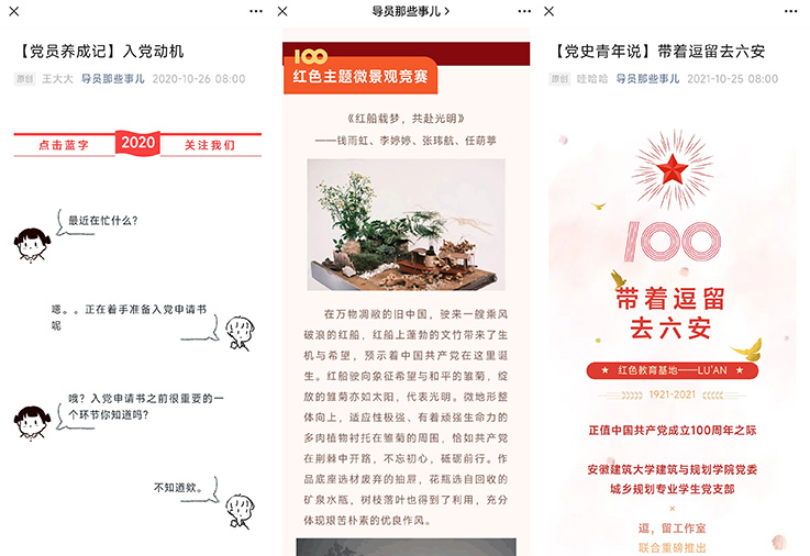 党支部借助“导员那些事儿”微信公众号平台、易班发展平台,创立“党员养成记”“党史青年说”专栏,通过大学生常用的社交平台加强思想引领。18城规程昕然撰写的《入党动机》,引导青年大学生树立正确的入党动机;17城规胡中昱撰写的《请党放心强国有我》通过“一个伟大梦想、四个伟大成就、一个伟大精神、九个必须、一个殷切希望、一个号召”一组关键词解读了习近平总书记在建党百年庆祝大会上的重要讲话精神;19城规钱雨虹撰写《带着逗留去六安》,记录了支部党员赴大别山革命历史纪念馆开展主题党日活动情景。通过喜闻乐见的“专栏”方式,引导青年大学生从红色资源中汲取营养,筑牢理想信仰根基、厚植爱国主义情怀,自觉培育和践行社会主义核心价值观,争做时代新人。