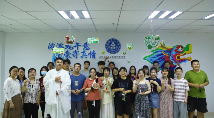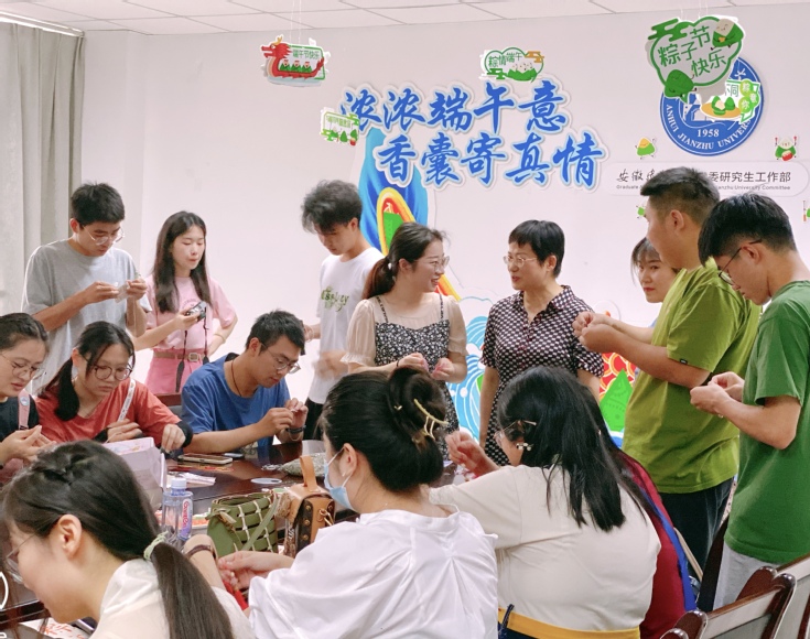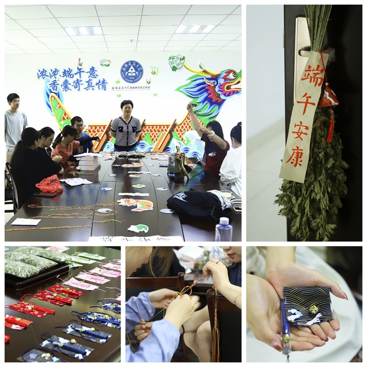 在优美的古筝乐曲中,大家重温传统习俗,感受传统文化,体味美好生活,通过缝、填充、封口、装饰,一个个别致的香囊在大家手中成型,不同形状,色彩亮丽,玲珑夺目、香气宜人的小小香囊承载着人们对端午节美好的愿望,看着各自精心缝制的香囊,大家心里充满了成就感。研究生们用一双双巧手,编制一个个精美的香囊,谢师赠友,小小的香囊,饱含着的浓浓深情。
