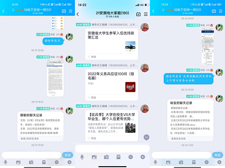 为鼓励广大学子响应国家号召,积极投身到保卫祖国的神圣事业中,5月2日至20日,土木学院组织开展应征入伍线上系列宣讲活动。各班辅导员充分发挥班级阵地优势,通过班级QQ群、微信群、“云上讨论”等形式,宣讲安徽省2022年入伍相关政策,介绍了土木学院近年来征兵工作情况,还重点围绕应征条件、入伍程序、优惠政策、直招军士等内容作了全面解读。