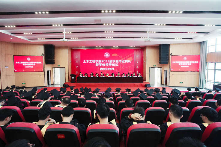 本网讯 6月9日,土木工程学院2022届本科生毕业典礼暨学位授予仪式在实验综合楼二楼报告厅举行。校党委常委、副校长蔡国军出席,土木学院党政负责人、各专业系主任、专业导师、全体辅导员及2022届毕业生代表参加典礼,典礼由学院分管学生工作负责人主持。