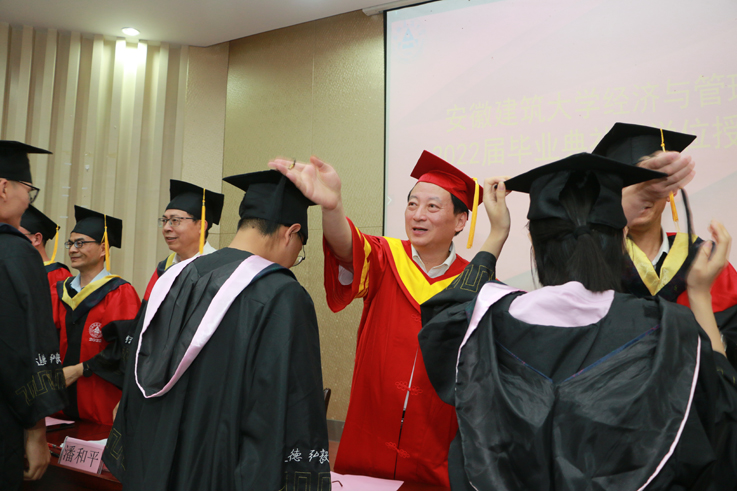 学院副院长宣读经管学院获得学士学位毕业生名单。在主席台就坐的领导和教师依次为参加毕业典礼的学生代表扶正流苏并合影留念。