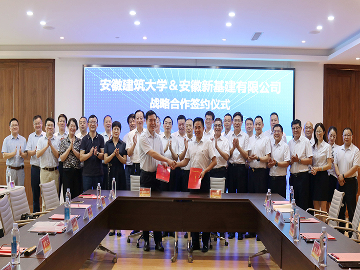 本网讯 6月9日,在合肥市高新区安徽新基建有限公司总部,学校与安徽新基建有限公司签订战略合作协议,联手打造未来城市建造创新基地。校党委书记孙道胜,党委副书记、校长黄显怀,党委常委、副校长蔡新立,党委常委、纪委书记、监察专员王玉兰,安徽新基建有限公司党委书记陈桂林、董事长曹文星以及学校、公司相关部门负责人参加签约仪式,仪式由安徽新基建总裁王元曦主持。